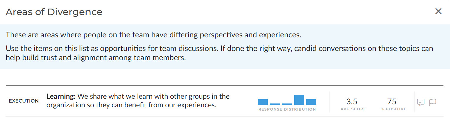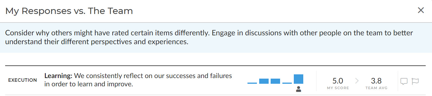 Examine areas where the team has the least amount of consensus. Compare your ideas with the rest of the team to understand their different perspectives and experiences. Discuss the gap analyses and identify team building opportunities to build trust and improve alignment.