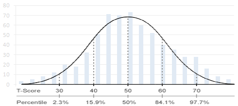 T-Scores are distributed in a bell-shaped curve, as illustrated above. 68% of T-Scores fall between 40 and 60. 96% of scores fall between 30 and 70. Only 4% of scores fall below 30 or above 70. This means T-scores fall within a narrower range than percentile scores. The scales below the bell curve show how T-scores compare to percentile scores.