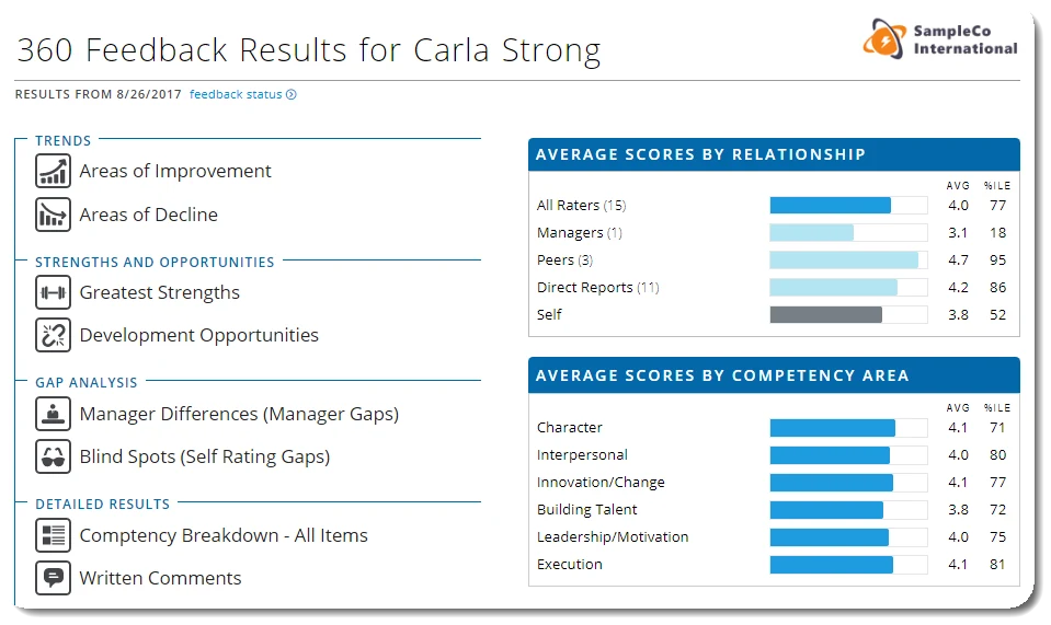 In the interactive dashboard, employees can see the overall results of the 360 degree feedback at a glance and easily drill into important details for a more complete picture. The assessment includes trends, strengths/opportunities, gap analysis, and more.