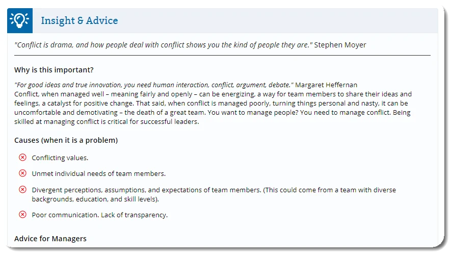 Insight and advice from our experts help you better understand the evaluation and take corrective action. The 360 degree feedback portal provides relevant information to better understand performance results, everything from causes of problems to tips for managers. It′s all right there when you need it.