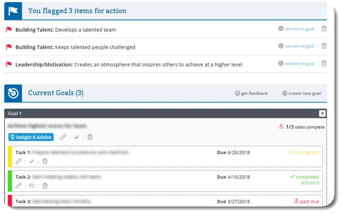 After flagging survey items for action, you can make development plans with goals, tasks and due dates. Easily check their completion status and mark them complete when done.
