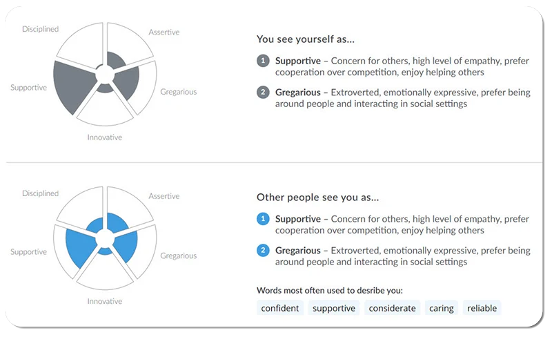 This optional chart shows the participant's interpersonal style in five important areas, with the difference between how they perceive themselves and how others perceive them highlighted.