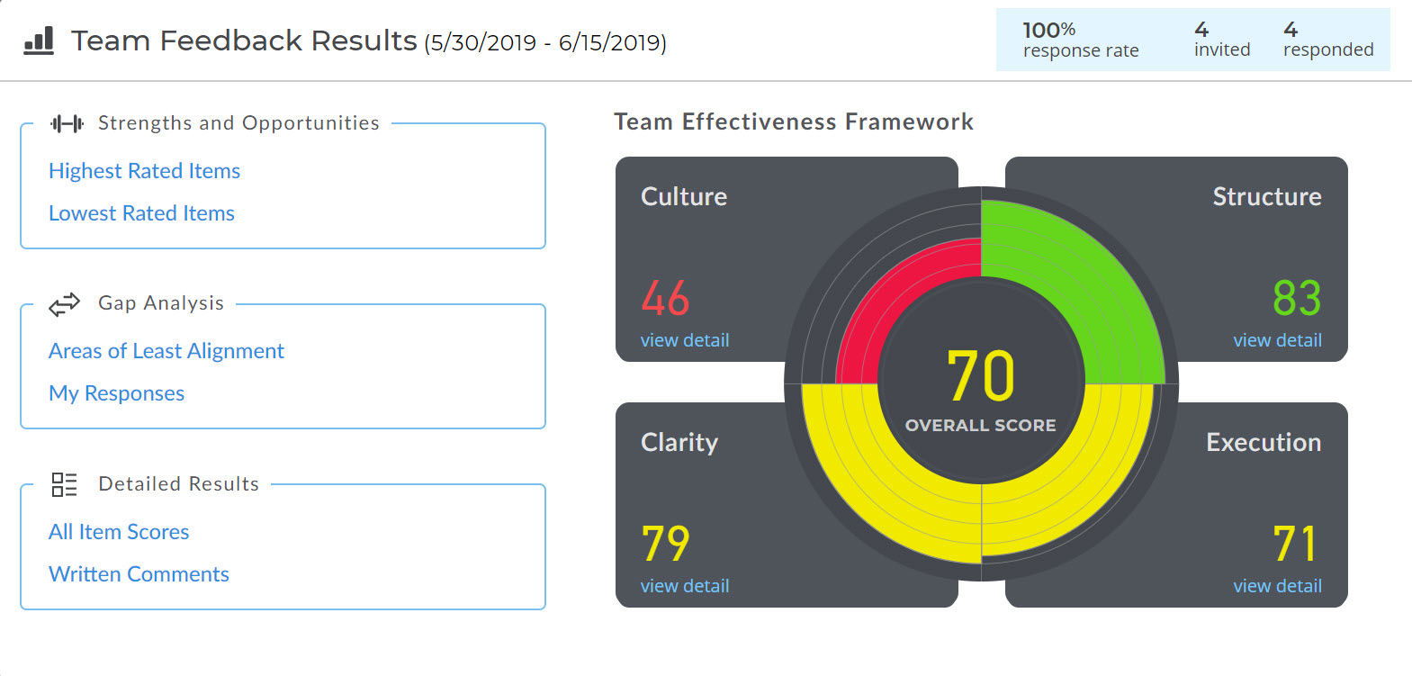The team assessment survey results are provided to everyone on the team via an interactive dashboard, where team members can see a high-level overview, analyze team effectiveness and performance, drill into important details, and download a printable copy of the report.