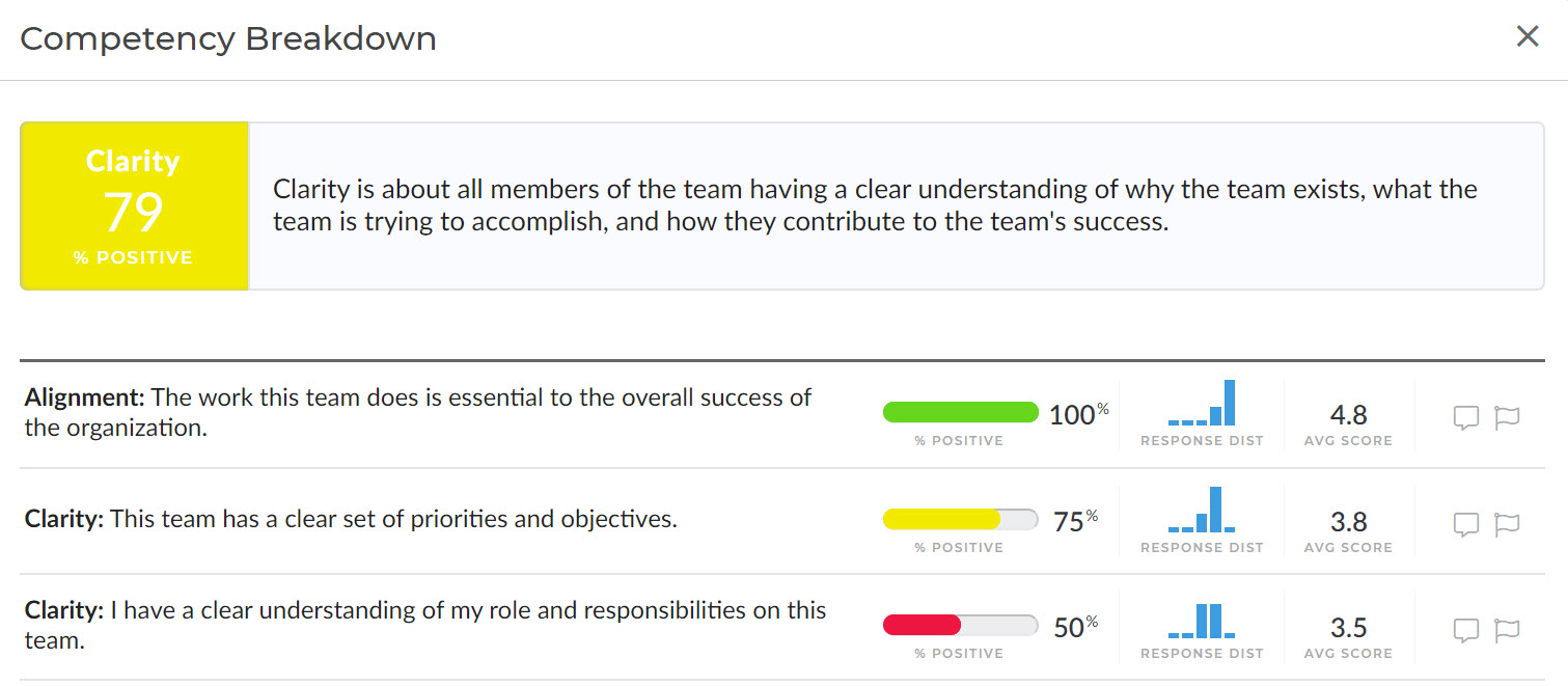 Clicking on any quadrant shows the team assessment survey items within it, sorted from highest to lowest score. For each item, we display the category, the percent of response that were positive, the response distribution and the average score.