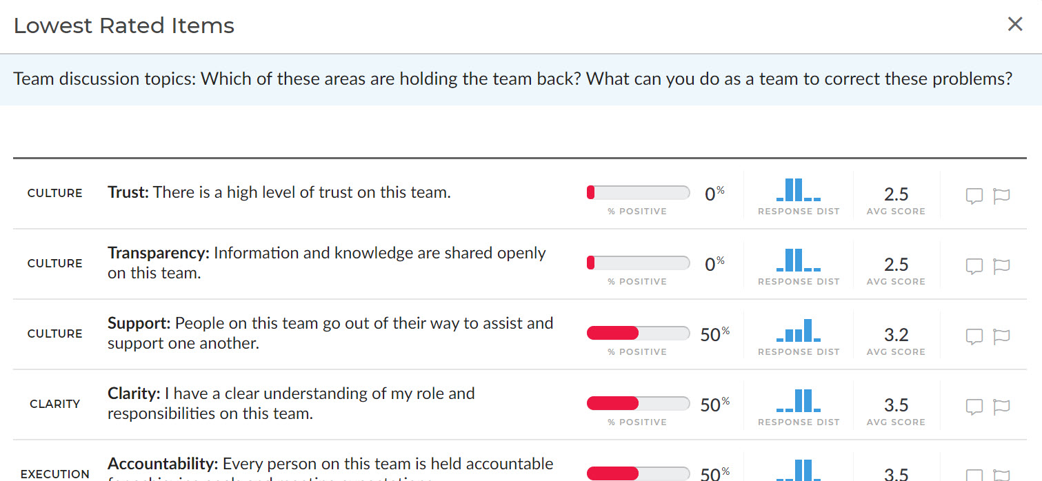 The survey report provides a solid overview of team dimensions and effectiveness. Leverage the team's strengths by identifying its top-rated survey items and shore up its weaknesses by uncovering the team's lowest rated items. Flag items you want to focus on for team building.