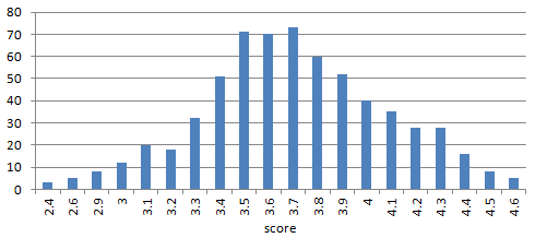 The vertical axis indicates the number of companies, and the horizontal axis indicates the score. For example, 20 companies received a score of 3.1.